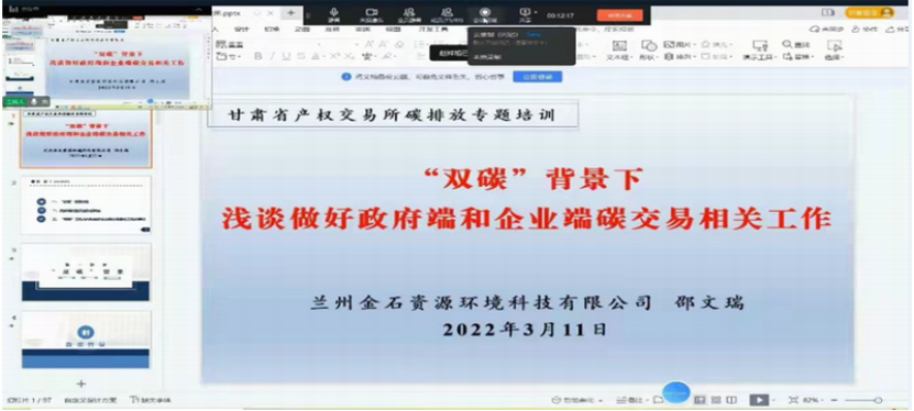 實現碳達蜂、碳中和,是以習近平同志為核心的黨中央統籌國內國際兩個大局作出的重大戰略決策,對我國實現高質量發展、全面建設社會主義現代化強國具有重要意義。企業特別是國有企業應當在推進碳達峰、碳中和中發揮示范引領作用。為全面做好“雙碳”背景下碳排放相關工作,服務更多企業實現綠色低碳發展,近日甘肅省產權交易所集團組織舉辦了“碳排放專題線上培訓會議”(第一期)。